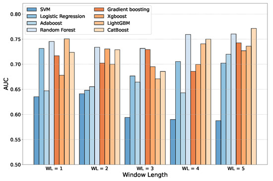 To answer these questions, we experimented with different machine learning models to identify the most promising time window length. In particular, we used the same ML models that have been considered the most effective in the literature for bankruptcy prediction [18]: Support Vector Machine (SVM); Logistic Regression (LR); Random Forest (RF); AdaBoost (AB); Gradient Boosting (GB); Extreme Gradient Boosting (XGB); and two other tree-based boosting ML models, LightGBM (LGBM) [41] and CatBoost (CB) [42]. Although they have not been used previously for bankruptcy prediction, these models recently achieved outstanding performances in other tasks when compared with AB, GB, and XGB.