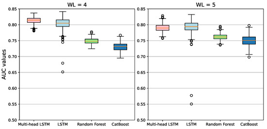 It is important to note that none of the ML models considered were designed to work on time series data, thus they considered all the variables as independent features. As expected, increasing the window length led to a longer training time on average for all the models (Table 4). However, all the models required just a few seconds of training with our hardware settings. However, the ensemble models performed better than SVM and LR with more variables and a larger window length. Moreover, using the 18 accounting variables for 4 or 5 consecutive years yielded a better result in terms of AUC, in particular with Random Forest ( for ) and CatBoost ( for ). A possible consideration is that although RF and CB showed similar overall performance, the computation time required to train CB was almost six times that required for RF. However, the computation time was not relevant in our experiments since the dataset was not particularly large. In light of this, we selected and to further study time series data with Recurrent Neural Networks.