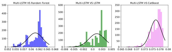 The experimental results described in the previous section and presented in Table 5 were computed as an average over 500 different runs and show that our model achieved much better AUCs with respect to the other models (LSTM, Random Forest, and CatBoost). We further analyzed these results to prove that our model’s performance was statistically significant. According to [44], a common way to test whether the difference between two classifiers’ results over different datasets or runs is non-random is to compute a paired t-test, which checks whether the difference in their average performance is significantly different from zero.