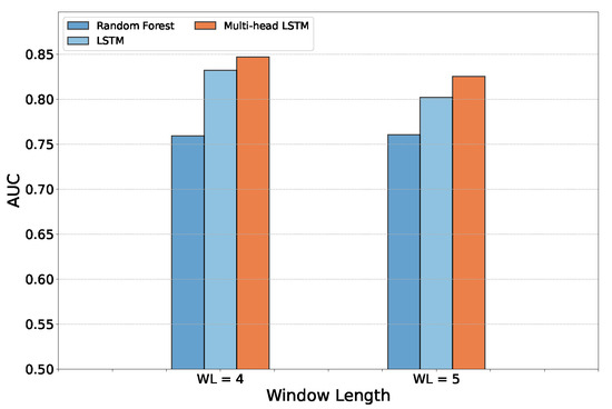 AUC values on the test set (2015–2018) for Random Forest, single-input LSTM, and multi-head LSTM when varying the temporal window (WL).