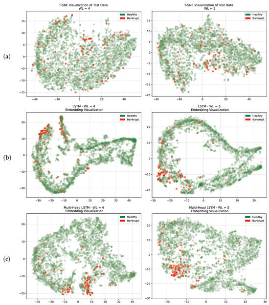 Two-dimensional t-distributed stochastic neighbor embedding (T-SNE) visualization of the test set. Each data point represents a firm. Subfigure (a) represents plain test data for WL = 4 and 5, (b) displays embeddings from single-input LSTM, and (c) shows embeddings from multi-head LSTM. These snapshots offer insights into the data’s intrinsic structure and the modeling impact on the representation.
