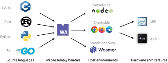 WebAssembly was developed by a consortium of companies, including Mozilla, Microsoft, Apple, and Google, as a solution to the limitations of existing technologies. WebAssembly is designed as a safe, fast, and portable compilation target for high-level languages like C, C++, and Rust, allowing them to be executed with near-native performance in the browser. It has gained widespread adoption and is currently supported by 96% of all browser instances [5]. Moreover, WebAssembly is also being extended to desktop applications [6], mobile devices [7], cloud computing [8], blockchain virtual machines (VMs) [9,10,11], IoT [12,13], and embedded devices [14].