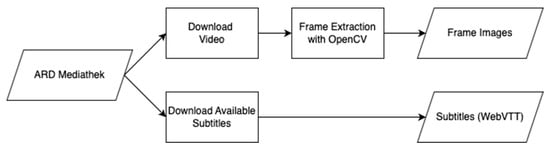 Within the scope of this article, we have conducted an analysis of media sources from ARD Mediathek []. ARD Mediathek was selected as the primary source for this study due to its status as an open and legally accessible library that allows for the downloading and processing of files. This media library offers a diverse array of content, including documentaries, series, movies, and news, providing a rich dataset for analyzing various formats. The availability of high-quality video streams and associated metadata, such as subtitles, titles, descriptions, and categories, makes it an ideal candidate for comprehensive geospatial analysis. The data acquisition process is designed to interface seamlessly with the ARD Mediathek API for the retrieval of video content. This process efficiently ensures the automatic selection and download of the highest-quality video stream, which is crucial for maintaining the clarity of frames required for precise image-based analysis. In parallel, available subtitles in WebVTT format, along with essential metadata such as titles, descriptions, and keywords, are also retrieved. The system is optimized for batch processing and scalability to enhance efficiency, enabling the simultaneous download of multiple videos and subtitles. This capability is instrumental in compiling a large and varied dataset within a manageable timeframe, especially considering the necessity of the highest available video quality. The data acquisition pipeline, as shown in Figure 1, creates a specific folder structure and naming convention for further analysis. If organized within the same structure, other sources can similarly be subjected to an automated analysis using the methodology outlined in the subsequent steps.