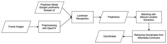 After the image extraction, we carry out an analysis of the visible image. In this stage, presented in Figure 2, we identify landmarks within the images extracted from the ARD Mediathek videos. Landmark recognition is integral to our methodology as it directly informs the geographical content of videos. By identifying landmarks, we can ascertain specific locations depicted within media, offering a visual anchor point for geospatial analysis. The key player in this process is an advanced machine learning model trained on the Google Landmarks Dataset v2 and further tuned for Europe [,], making it highly practical and relevant for our task. The model was selected because it is the only freely available model that was explicitly trained for landmark recognition based on a sufficiently large and recognized corpus.