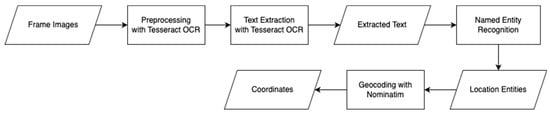 Furthermore, the advent of Optical Character Recognition (OCR) [,,] and automatic speech recognition [,] has opened new avenues for extracting geospatial data from videos. OCR technology can convert visual information into machine-encoded text, enabling the identification of textual information embedded in video frames, such as street signs or text overlays [,,]. Similarly, audio-to-text transformation tools can transcribe spoken words within videos, processing them like subtitles to parse location references [].