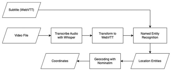We employ the Levenshtein ratio metric, a key component in our evaluation process, to assess the transcription quality by comparing the Whisper-generated entries against the original subtitles []. This method enables a differentiated assessment of the accuracy of the transcription against the spoken word. The subtitles are a valuable benchmark in this process due to their alignment with the audio track. After transcription, the text and available subtitles are analyzed using NER and geocoding as previously described. The complete process is shown in Figure 4.