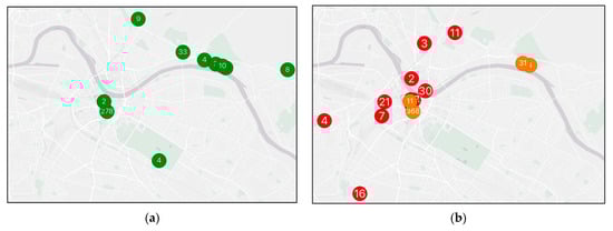 Figure 5 shows an example of location references from the video “Sagenhaft—Dresden”. To show the high-resolution accuracy of some of the recognized location references, only one section was selected. Some of the location references (e.g., “China”, “Japan”, and “New York”) are therefore not visible here. On the left side (a), the green circles represent true positives, and the numbers in them are the number of hits for the location. In the city center in particular, there are many hits; this is where the generic “Dresden” is placed by Nominatim. The right side shows false positives in red and false negative (missed) location references.