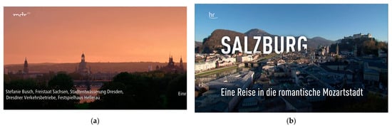Conversely, text overlays within videos—such as the names of interviewees or credits—were more reliably captured by the OCR technology. These elements typically possess a clearer contrast against the background and a standardized placement, which facilitates more accurate recognition by the OCR algorithms. However, such overlays, as seen in Figure 7a, were not prevalent in our test selection, limiting our ability to assess the OCR technology’s efficacy in this domain fully. Future studies could benefit from including a sample of content rich in overlays, like news programs, which frequently employ on-screen text to convey information. Figure 7a shows an instance in which only one (“Festspielhaus Hellerau”) of three location references (the others are “Sachsen” and “Dresden”) is recognized by OCR. Interestingly, all three location references were not considered during manual acquisition. A title card from which OCR was not able to recognize text can be seen in Figure 7b. In this specific case, a location reference could not be recognized here.