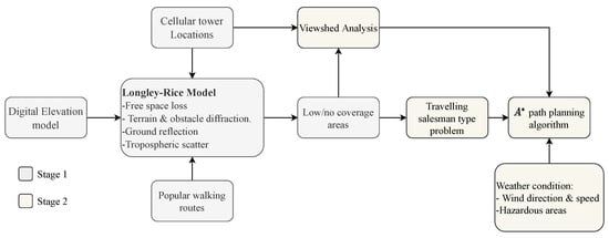 A two-stage framework is proposed to address path planning optimization for UAV relay positioning, as depicted in Figure 1. The first stage aims to predict the likely locations where MR services are required to aid victims experiencing low mobile coverage. Notably, the location of nearby cellular towers and a digital representation of the terrain elevation are combined to model the coverage of relevant cell-towers. This is achieved by computing the signal propagation pathloss at each point along popular walking and hiking routes using the Longley–Rice propagation model. Areas of the tracks with undesirable coverage are subsequently identified as areas of interest.