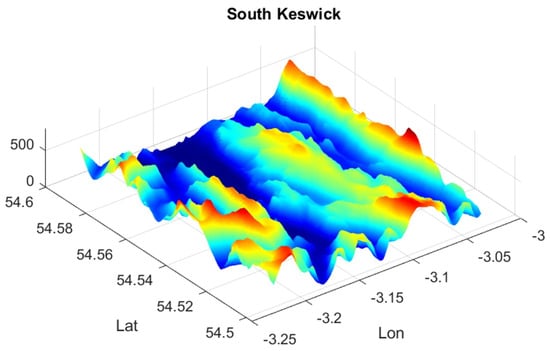 The proposed framework was evaluated through a case study of the Lake District national park, focusing on Keswick as a region with high mountainous peaks and frequent emergency callouts. Elevation data were obtained from the open-access Shuttle Radar Topography Mission (SRTM) 1-arc global dataset [34], which has a 30 m resolution (at sea-level at the Equator). Each data file covers a one-degree-of-latitude by one-degree-of-longitude tile of Earth’s surface. The dataset is composed of the following formats:
