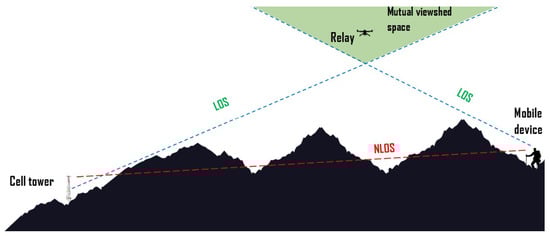 A viewshed is defined as the ensemble of points or areas that are visible from a certain location. A viewshed analysis is thereby crucial in UAV relay planning to determine the regions where a UAV relay simultaneously maintains direct line of sight to the areas of interest and cell-towers (see Figure 3).