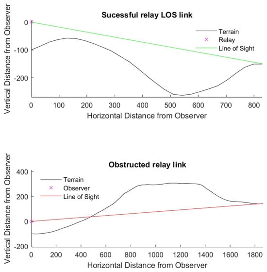 To evaluate the performance of the proposed approach, the developed algorithm was compared against a non-blockage version of the path planner, where the UAV could freely fly to any area on the map. The total number of successful links divided by the distance traveled was used as the performance metric to evaluate the different paths. This assumed that a successful link was obtained between two points if direct line of sight was possible with both points. This is exemplified in Figure 4 for both successful and unsuccessful links.