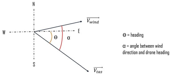 The UAV heading/angle and wind direction, however, change throughout mission execution, as depicted in Figure 5. The true air speed can, therefore, be determined using