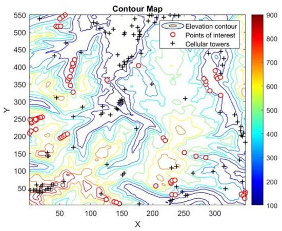 Several studies have investigated risk prioritization to determine areas of higher risk to people. In [5], fuzzy logic was used to create a risk/occupancy map and determine emergency zones in terms of visiting frequencies, wildlife, and environmental conditions. Such an approach, however, requires expert knowledge of the area and other data that are often not available. Deterministic propagation models [6] have been further used to identify areas that require assistance due to a lack of signal connectivity [7]. Here, factors such as rain, vegetation, and interference caused by nearby channels or solar radiation attenuate and distort the signal [8]. The Longley–Rice propagation model was combined with digital elevation terrain data to calculate the pathloss along the trajectory of mobile network nodes in mountains [9]. The study concluded that optimally positioned relays are required to ensure communication between nodes. Similarly, ref. [10] proposed terrain-based channel modeling for a fixed height static UAV relay to generate propagation pathloss and blockage maps for LTE using terrain and LIDAR data of rural areas. Terrain elevations and obstacles, however, were not considered in this study, reducing its applicability to mountainous areas.