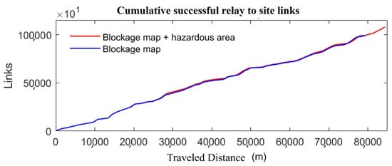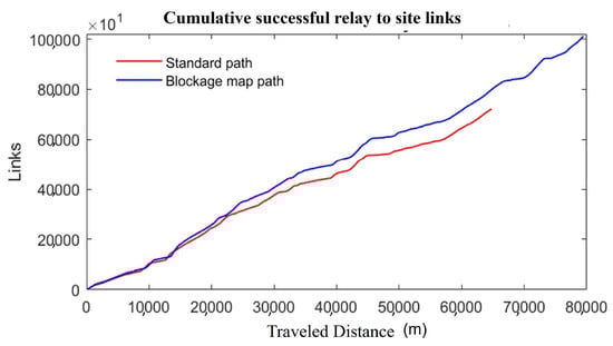 Figure 12 shows the obtained results and Table 3 summarizes the average number of successful links under hazardous weather. The results show that by incorporating these scenarios into the algorithm, a slight increase of 6.1% was obtained in path length, and a proportional increase of 6.9% was obtained in successful links. These results were further confirmed by the cumulative link plot shown in Figure 13.