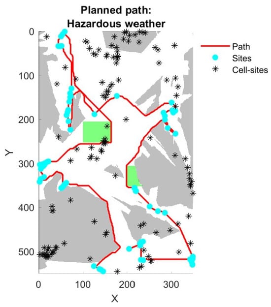 The proposed approach was further extended to consider scenarios where the weather affects the followed path. The hazardous weather conditions considered in this research are heavy rain and strong wind gusts. These scenarios were embedded in the algorithm to force the UAV to take a detour.