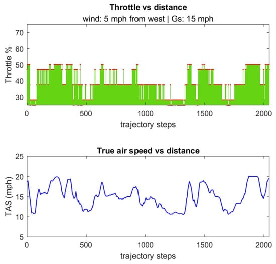 The effect of wind for throttle modulation was simulated for a fixed ground speed of 15 mph, a wind speed of 5 mph flowing from the west, and a maximum UAV TAS of 40 mph. Specifically, the heading angle was constantly changed throughout the path to model the influence of wind. Figure 14 shows the throttle and true air speed of the UAV to ensure a fixed ground speed. Notably, a required TAS above 15 mph implied that the UAV was flying in the opposite direction to the wind and required an increase in throttle. Conversely, when the TAS was lower than 15 mph, the UAV was flying in the same direction as the wind, such that the throttle could be reduced.