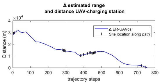 The energy-aware decision-making process for the selection of the first charging visit along the path was assessed under the proposed throttle simulation conditions for an assumed station coordinate of . All three possible conditions discussed in the Section 2 were implemented and are shown in Figure 15.