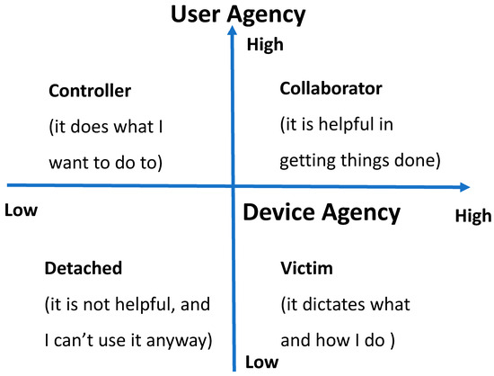 Agency is a notion that has made a variety of appearances in several different disciplines over the past few decades. In psychology, the common term is sense of agency, which refers to the feeling that one is in control of one’s actions and their consequences; when people take action, they tend to feel that they are in charge of the action and not that the action happens to them [2]. In Human–Computer Interaction, the term of agency has been used for a long time, but it has often been reduced to denote people’s feeling of being in control of a device [3,4]. A more detailed understanding of the user’s perception of their agency and of the agency they are willing to see ascribed to their device can improve our understanding of the challenges that different users might have in adopting different devices. Consequently, an understanding of user–device relationships as emerging from agency attributions also supports more tailored interface developments.