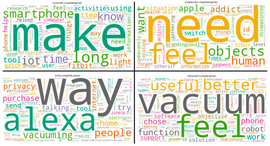 We grouped the respondents according to high and low user and device agency in the fourfold matrix of user–device agency (Figure 1). We then extracted the relevant keywords of the comments using a technique called bag of words where we analyzed the most relevant keyword in the text. The text had a pre-elaboration process consisting of two phases: