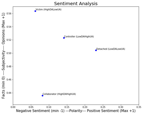 Victims and collaborators are similar on the axis of Polarity, as they are both skewed toward neutrality rather than positive sentiment; however, we can observe a difference on the axis of Subjectivity. Supporting the profiling of victims as attributing low agency to themselves and high agency to their devices, their discourse is more opinion-based and draws less from factual language.