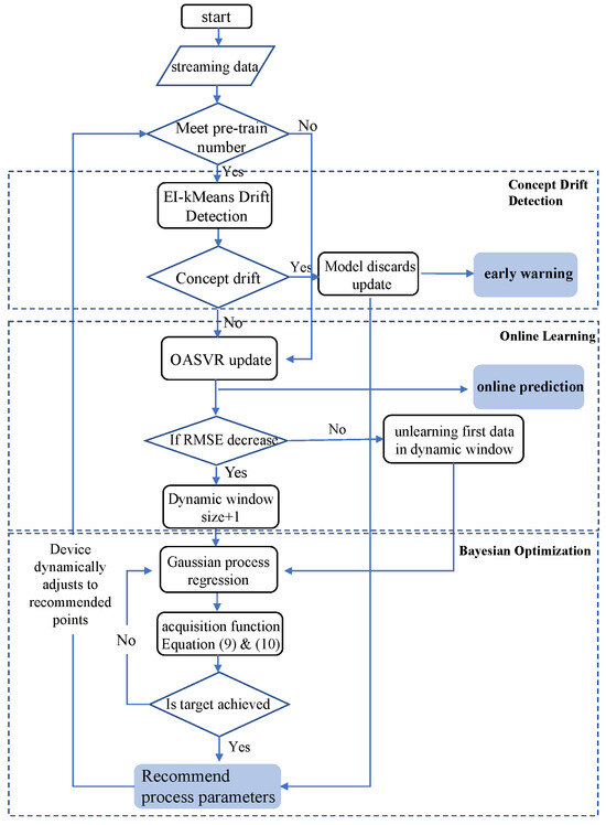 The overall algorithm execution flow for the online optimization and design of process parameters combining EI-kMeans concept drift detection, OASVR and adaptive learning rate Bayesian optimization is shown in Figure 2. Utilizing this framework allows for online data drift detection and warning in industrial scenarios and the online prediction of equipment processing performance, as well as the online optimization and recommendation of equipment process parameters.