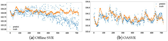 We compared OASVR with offline SVR, with the experiment set on the same dataset (K3 dataset). Initially, we pre-trained both models with 500 data points using the same hyperparameters. We then compared the prediction performance of OASVR and offline SVR, and the results are shown in the following Figure 3.