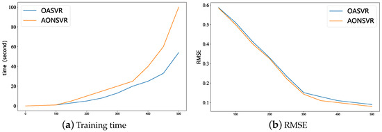 Figure 4a represents the training time of the model. From the graph, we can see that, with the same training samples, the training time of the model is reduced by half, while, comparing with Figure 4b, the prediction performance of the model is not significantly reduced. With a training data size of 500, the RMSE for OASVR is 0.09, while the RMSE for AONSVR is 0.07. This indicates that the OASVR algorithm has similar performance to AONSVR but is more efficient.