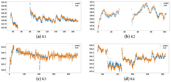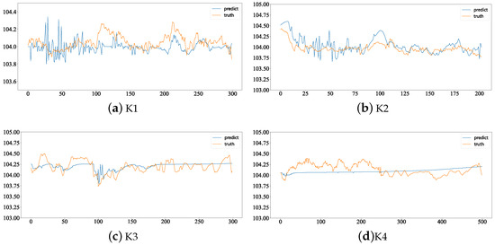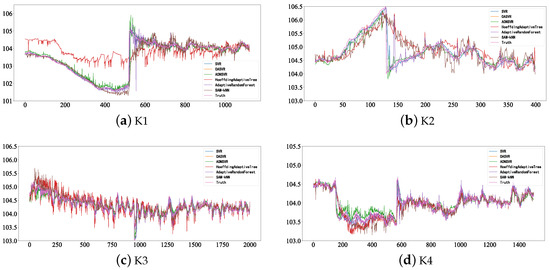The predictive results after incorporating concept drift detection are shown in Figure 7. From Table 2, we can know that the average of OASVR-EIk is 1.85% higher than OASVR on four datasets. Figure 7 shows the predictive result of OASVR-EIk. While OASVR demonstrates some capability in handling noise, it still struggles with abrupt concept drift. OASVR-EIk does not online train the data detected by EI-kMeans as experiencing concept drift. This prevents OASVR from updating weights for erroneous data, allowing the model to fit a more reasonable data distribution and thus improving the overall performance.