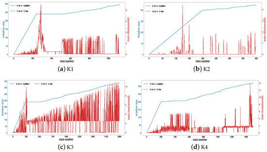 Dynamic window size and corresponding training time for each streaming data during the OASVR training process on four different datasets: K1, K2, K3, K4.