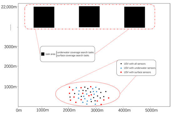 In Figure 1, the operational area of the USVs is confined to a rectangular zone measuring 5000 m by 22,000 m. The red squares represent USVs equipped with surface detection sensors, the blue triangles indicate USVs with underwater detection sensors, and the black dots denote USVs carrying both types of sensors. The black rectangular area at the top represents the mission area, with each USV allocated to a maximum of one mission area for conducting detection tasks. The capabilities of the USVs within the scenario vary, specifically in terms of their maximum sailing speeds (5 m/s to 10 m/s), the types of sensors carried, and their maximum coverage detection speeds (1.4 m/s to 2 m/s). The sensors onboard the USVs are capable of detecting information within a 100 m radius of their location.