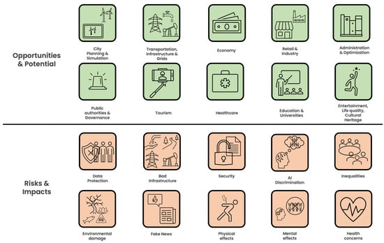 Figure 2 graphically compares the opportunities and potential with the risks and impacts that can arise and occur when using metaverse applications in the smart city sector. It is essential to balance these two aspects.