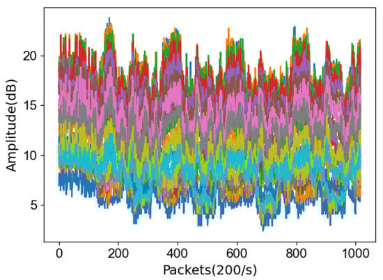 where and represent the number of antennas at the transmitter and receiver, respectively. Each antenna pair corresponds to a total of 30 carriers. Figure 1 illustrates the amplitude characteristics of 30 subcarriers generated for users by specific antennas. These magnitude features serve as our raw data and will be input into the subsequent preprocessing stages.