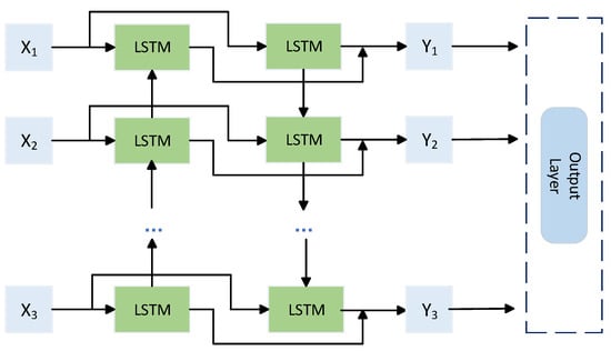 Wi-Fi signals, typically being time-series data, are best classified using recurrent neural networks (RNN). However, traditional RNNs, along with their variants such as long short-term memory (LSTM) networks [36] and gated recurrent units (GRU) [37], can only capture past information. For tasks like activity recognition that require consideration of sequential actions, both past and future information are equally important. Hence, the BiLSTM was introduced as a foundational neuronal structure. BiLSTM comprises forward and backward layers capable of extracting temporal features from both past and future data, thereby enhancing recognition accuracy, as depicted in Figure 3. In this architecture, the hidden state of BiLSTM at time point is represented by
