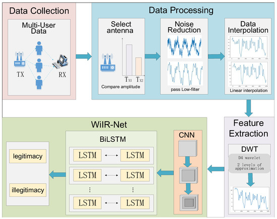 The utilization of WiFi devices for sensing applications has a significant historical background. In 2000, Bahl et al. [20] introduced the Radar system, pioneering the use of received signal strength (RSSI) for indoor localization, marking the inception of WiFi for sensing purposes. In 2012, Chetty et al. [21] achieved motion sensing through the analysis of Doppler frequency shifts. Similarly, in 2012, Halperin et al. [22] utilized a commercial network card CSI from commercial NICs for motion sensing, providing a more refined and stable foundation for WiFi-based identity sensing. In 2016, Zhang et al. [11] proposed WiFi-ID, pioneering the integration of WiFi sensing into identity recognition for the first time and leveraging CSI data. Since then, WiFi-based identification systems have undergone extensive development, including non-line-of-sight (NLOS) [12,13], cross-domain [23,24,25], and multi-user [26,27,28] WiFi identification approaches. However, in the aforementioned identification systems, the classifier’s classification categories are predetermined. Consequently, when an unauthorized individual is present, their category does not match any known categories in the classifier. Despite this, the classifier erroneously classifies them as a known legitimate user. This limitation renders the system incapable of accurately determining the legitimacy of an individual’s identity, leaving it vulnerable to intrusion by unauthorized individuals.