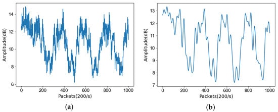 Comparison of amplitude low-pass filtering. (a) CSI before low-pass filtering; (b) CSI after low-pass filtering.