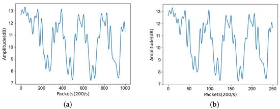 CSI data contain abundant human motion information, but direct recognition entails substantial computation and often falls short of ideal accuracy expectations. Therefore, it is essential to perform feature extraction operations on effective activity segments within CSI data. Wavelet approximation coefficients possess the capability to extract key features from signals and mitigate data redundancy compared to time-domain and frequency-domain features. The wavelet transform effectively preserves highly variable features such as pulses and peaks of the original waveform, rendering them highly representative. Hence, we employed the discrete wavelet transform (DWT) algorithm to conduct wavelet decomposition of the CSI data and compute its approximation coefficients. As illustrated in Figure 7, This method significantly reduced the data volume without altering waveforms, thereby enhancing the efficiency of feature extraction. Compared to traditional feature extraction methods, wavelet-based feature extraction can more effectively capture dynamic information and patterns of change in CSI data, thus providing a more reliable foundation for subsequent classification and recognition tasks.