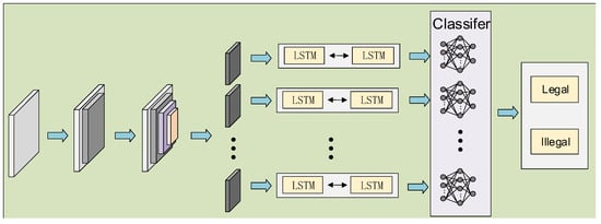 The WiIR-Net network model comprises multiple CNN convolutional layers and five BiLSTM branches, each dedicated to a single legitimate user. WiIR-Net employs a multilayer convolutional network with an activation function to extract feature information from all users. Subsequently, it extracts unique features for each user through five independent BiLSTM layers. To simultaneously determine the legitimacy of multiple users, we employ five binary classifiers. Initially, features of each user are extracted using the network, and these features are then input into the five binary classifiers. By comparing the outputs of these classifiers with a threshold, we predict the target user as legitimate if the output exceeds the threshold. Conversely, if it falls below the threshold, we predict the user as illegitimate. This approach optimally utilizes the individual user identity information extracted by the deep learning model and the discrimination capability of binary classifiers to achieve multi-user legitimacy authentication. Using five binary classifiers for multi-user identification offers the advantage of enhancing system performance. In the subsequent experiments, we conducted comparative studies to validate this concept. By aggregating these judgments, we obtained the final multi-user identification result. This approach effectively addresses multi-user scenarios and provides more accurate identification capabilities. The model is depicted in Figure 8 below.