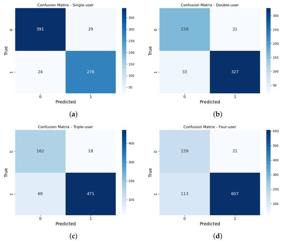 In the multi-user legitimacy authentication, we conducted separate tests in scenarios involving double-user, triple-user, and four-user scenarios. The specific procedures were as follows: we initially partitioned 70% of the legitimate single-user dataset for training. The data on legitimate and illegitimate combinations of different user counts were used for testing to evaluate the system’s performance in the following aspects in multi-user legitimacy authentication. The evaluation results are elucidated using a confusion matrix in Figure 10b–d.