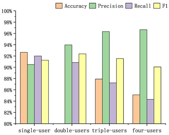 The overall performance, as depicted in Figure 11, showed that the Multi-WiIR achieved accuracy rates of 92.64%, 90%, 87.91%, and 85.11% in the single-user, double-user, triple-user, and four-user scenarios, respectively. This result indicated that our accuracy remained, even in private settings. This achievement can be attributed to the utilization of a multi-branch approach within our system for extracting the features of a single-user, thereby mitigating potential interference from other users. Notably, within the context of triple-user and four-user scenarios, the precision significantly surpassed the other scenarios, owing to the lower presence of illicit users juxtaposed with a higher prevalence of legitimate users, consequently resulting in the highest precision upon reevaluation. Importantly, within this model, the overall false positive rate stood at a mere 3.2%, thus decisively validating the system’s efficacy in preempting unauthorized intrusions.
