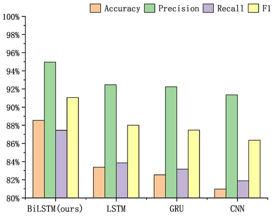 As depicted in Figure 12, the average accuracy achieved by our BiLSTM model in multi-user scenarios was 88.54%, representing an improvement of nearly 5 percentage points over LSTM’s 83.45% and GRU’s 82.56%. This notable difference in performance substantiated the superiority of our selection of a BiLSTM architecture.