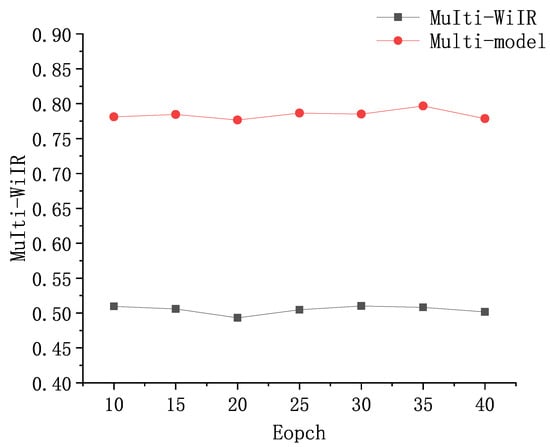 To assess the enhanced running efficiency of Multi-WiIR in contrast to multiple binary classification models, we conducted a comparative analysis of their training times and test set outcomes on the same computing platform. Figure 13 illustrates the comparison of the time consumption by both systems across various training epochs, ranging from 10 to 40 epochs. The average training time for Multi-WiIR was calculated to be 0.5088 s per epoch, whereas the average training time for the multiple models amounted to 0.7924 s per epoch. This indicates that Multi-WiIR reduced the training time by 35.8% compared to the multi-model training duration. Moreover, it is noteworthy that the initialization time of the multi-model system significantly exceeded that of Multi-WiIR. In summary, our findings suggest that Multi-WiIR effectively enhanced the operational efficiency of the system when compared to the multi-model multi-user legitimacy authentication system.