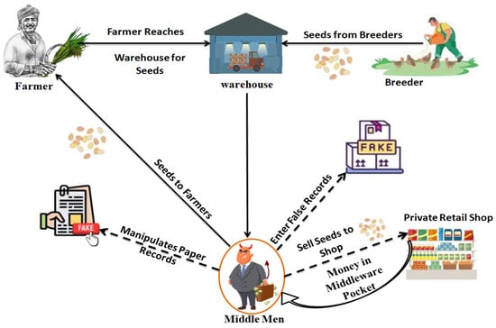 The existing seed supply chain in agriculture employs minimum technology and is based upon the manual updating of records, which is tangible and prone to malpractices, such as the misrepresentation of product availability and the black marketing of important and in-demand seeds, as depicted in Figure 1. The government’s role in the pricing, sale, and purchase of products creates significant opportunities for corruption []. In India, corruption at Food Corporation of India (FCI) warehouses is often reported, wherein officials input incorrect information into their government databases. For example, if a farmer purchases 50 kg of seeds, FCI officials would often record it as 100 kg sold, and the remaining 50 kg are back-channeled and sold later, creating an expensive market for the same. While such actions lead to increased corruption in the government, they also make it difficult for a poor farmer to access good-quality seeds and fertilizers, which is a huge problem in the initial stages of the food supply chain []. For agri-food, a detailed survey was conducted, and a framework corresponding to the Vietnamese cashew nut business [] was discussed. To efficiently address concerns in Iraqi agriculture, blockchain technology has been incorporated so that it can benefit from growth-promoting solutions to enduring problems. It can increase productivity and competitiveness by improving data management, accountability, and intelligent contracts. Notwithstanding these challenges, blockchain’s advantages, such as its efficiency and transparency, make it a wise investment for Iraq’s agriculture industry []. The potential of blockchain technology in precision agriculture, food supply chains, crop insurance, and agricultural product transactions is examined in [], taking into account both theoretical frameworks and real-world applications. It also tackles the difficulties in logging farm-owner transactions and creating an ecosystem powered by blockchain for the food and agriculture industries. A blockchain-based system, “AgriOnBlock”, was designed to address issues in the agriculture industry to enhance transparency among various stakeholders, such as bankers, retailers, customers, farmers, wholesalers, etc. []. It intends to handle relevant issues within the industry and efficiently connect stakeholders by utilizing Ethereum smart contracts and Internet of Things (IoT) devices. A blockchain framework that is based on the IoT and incorporates an artificial intelligence system is intended to oversee and control smart water management []. An IoT-based smart water irrigation system is recommended to efficiently address the water crisis in the agriculture industry today, taking into consideration several factors, such as fertilizer quality. Most of the existing techniques primarily focus on food supply and food security, which should benefit all stakeholders by increasing transparency and trust among all of the stakeholders involved in the farming sector. However, seeds, which are the pioneering and fundamental elements in the farming sector, have not received enough attention.
