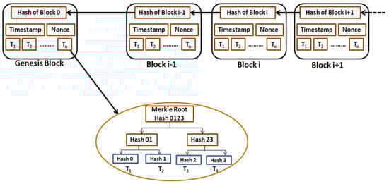Blockchain comprises a series of blocks that contain records of all transactions that have been carried out across the network. The initial block in the blockchain sequence is referred to as the genesis block and lacks a preceding node, known as the parent node. Subsequent blocks reference the previous block by its hash value, establishing a sequential chain. Each block consists of a body and a block header, as depicted in Figure 2. Specifically, the block header includes the parent block hash of 256 bits and the sum of all block transactions, i.e., the Merkle tree root hash, as well as the block version, 4-bit Nonce, and timestamp expressed time in seconds.