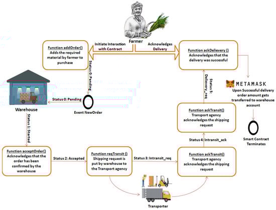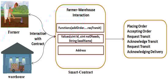 For instance, a smart contract is deployed on the Ethereum blockchain, which will record a transaction between a farmer and a warehouse whenever one takes place. So, whenever an order is started, the contract is triggered, and it keeps updating the status of the order on-chain in an automated manner. Since this contract is already deployed and the logic cannot be altered, the status of the order cannot be manipulated by anyone, which helps us achieve a list of records that cannot be changed and are non-disputable. The contract is responsible for maintaining faith in the seed-purchasing process, and all the relevant parties have a limited scope of participation in the purchasing process [].