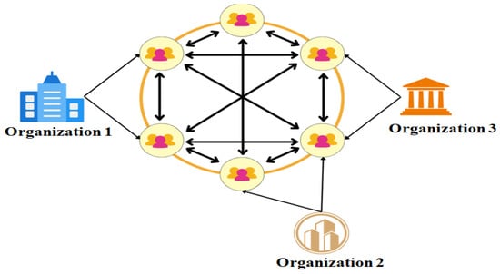 - Consortium blockchain: Figure 7 depicts the consortium blockchain, as it shares similarities with the hybrid blockchain on the grounds of having both public and private features. The differentiating factor for this blockchain is that various organizations collaborate in a decentralized network, hence eliminating the risk of one entity’s monopoly over the entire network.