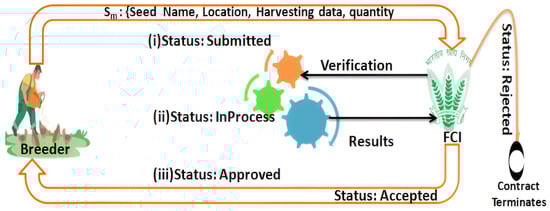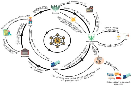 Breeders procure seeds and get them validated through a government entity such as a food corporation, which validates the seeds and stores them in their warehouses, which are provided to the farmers based on their demand []. The food supply chain is critical in terms of its impact on a country’s economy and its relevance to sustaining the essential sector of any country. In this supply chain, the exchange of goods relies on complex and paper-thin settlement processes, and these processes are not very transparent, with a high risk to breeders and farmers during the exchange of value. Since transactions are prone to fraud, middlemen step in, increasing the total costs of remittances and making it difficult for the farmer to receive the right product overall.