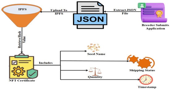 Approve Seeds: Breeders submit seeds along with their meta-data , i.e., the seed name  and location , where the seeds are harvested , and their quantity , to FCI, which calls Algorithm 4 to check the quality of seeds and, based on that, mints an NFT as a certificate, as shown in Figure 9, to approve the seeds or otherwise rejects the seeds. The flowchart for approving seeds is depicted in Figure 10.