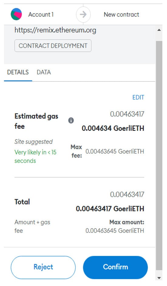 The Remix IDE (remix.ethereum.org accessed on 3 March 2024) was used to develop this contract, and the Ropsten test network, which is a test blockchain network, was used for deployment. An Application Binary Interface (ABI) and a contract address are formed following the smart contract’s successful compilation, and they are copied and used. The contract is then initialized in the NodeJS code using the ABI and contract address, making it possible to call the subsequent methods that were explained. The project as a whole is tested on a local network before the smart contract is released to the Ropsten test network. Users connect to Metamask using the front end of a web browser like Chrome, and whenever a transaction needs to be made that will modify the blockchain or a user-end method needs to be called that will modify the blockchain, a Metamask popup will appear to request permission and display the gas price that will be used to execute the transaction. Accessing data stored on the blockchain is free, but gas fees are incurred only when altering data. Each time that any user changes the state of the blockchain, a gas fee in Ether has to be paid. The time taken by the transaction is inversely proportional to the gas price entered by the user. Sometimes, the transaction can be canceled, too. When the DApp loads, a contract instance is created and gets stored in the state of that particular React class component, which gets passed to its child components, and the contract methods can be used from there.