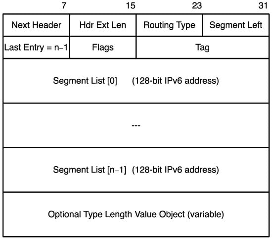 - Filsfils, C.; Dukes, D.; Previdi, S.; Leddi, J.; Matsushima, S.; Voyer, D. IPv6 Segment Routing Header (SRH). IETF RFC 8754, 2020. Available online: https://datatracker.ietf.org/doc/html/rfc8754 (accessed on 19 March 2024).